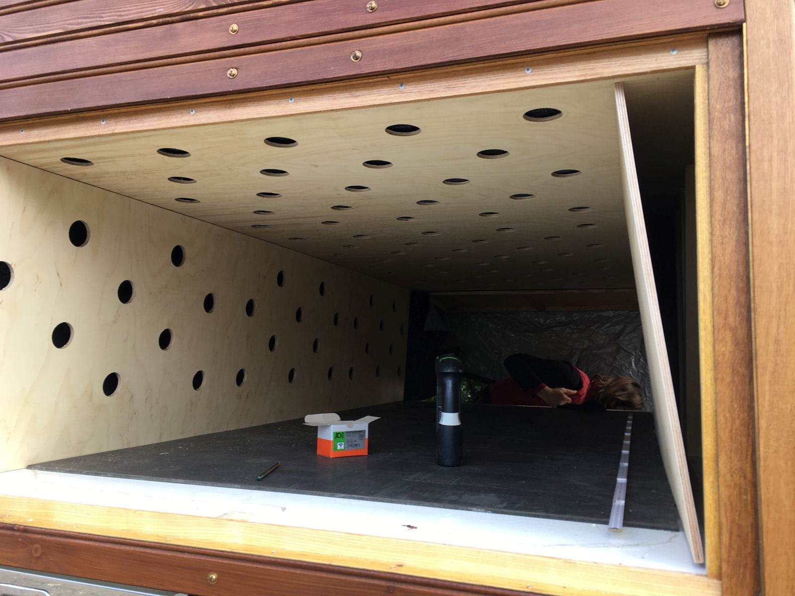 Zunächst stellten wir die Innenverkleidung unseres Kofferraums her. Da dieser zum Wohnraum hin gedämmt ist, muss aus der Dämmung diffundierende Feuchtigkeit nach außen – in diesem Fall in den Kofferraum – gelangen können. Dementsprechend wurde die Sperrholzverkleidung großflächig mit sauber gefrästen Löchern versehen. Da die Schweizer-Käse-Optik zwar reizvoll, jedoch von geringem Gebrauchsnutzen ist und uns zudem nicht wirklich gefällt, wird später noch ein Autoteppich angebracht, der die Löcher verdeckt.