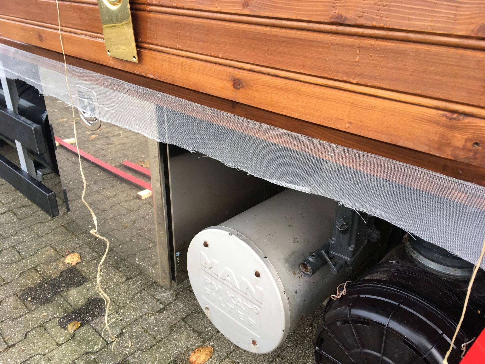 Die Profile wurden passend zugeschnitten, Löcher zur die Befestigung gebohrt und gesenkt, und anschließend alles zur Lackierung vorbereitet. Zeitbedarf: mindestens zwei Tage. Ein guter Nachbar hatte erfreulicherweise Kontakt zu einer Lackiererei, so dass wir für kleines Geld sämtliche Teile in der Farbe unseres LKW pulverlackieren lassen konnten. Die anschließende Montage ging dann tatsächlich flugs von der Hand.